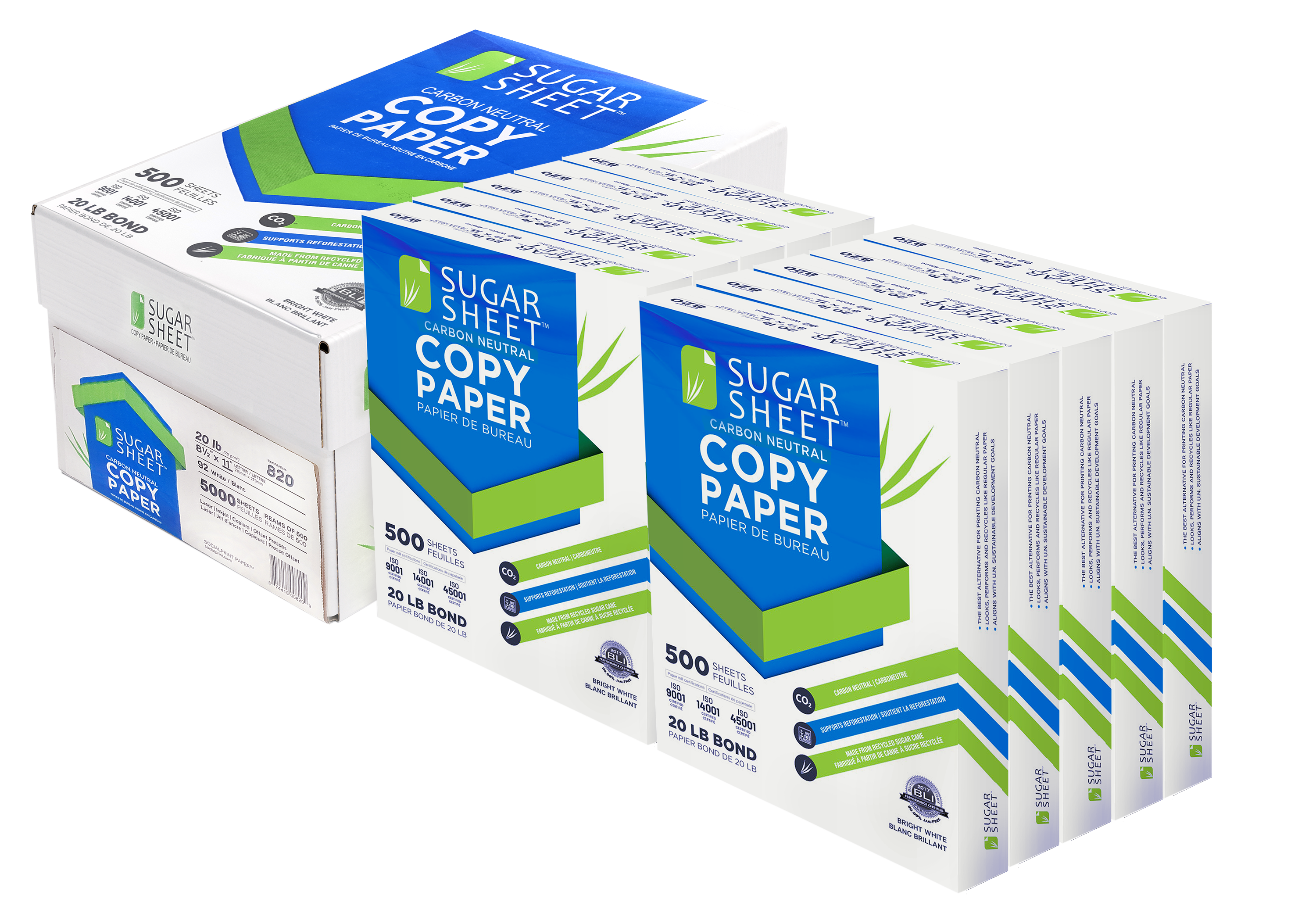 Sugar Sheet™ copy paper is made from recycled sugar cane fibre. It looks, performs, recycles, and costs the same as recycled paper, but is carbon neutral and uses zero wood byproducts.